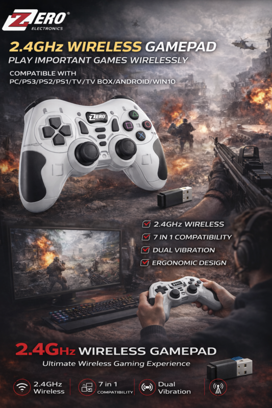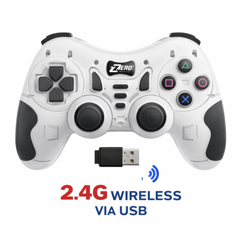 وحدة تحكم ألعاب لاسلكية ZERO-7501- بتردد 2.4 جيجاهرتز مع منفذ USB – متوافقة مع أجهزة الكمبيوتر الشخصية، وأجهزة بلاي ستيشن 1، وبلاي ستيشن 2، وبلاي ستيشن 3، وأجهزة أندرويد، وأجهزة التلفزيون الذكية، وويندوز 10