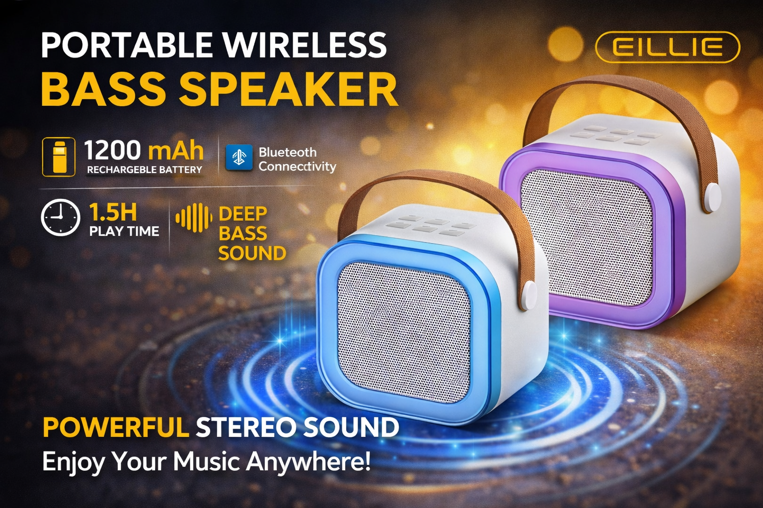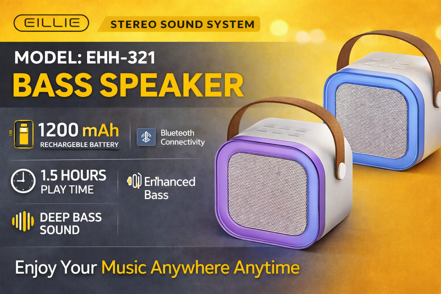 The EILLIE EHH-321 portable speaker features powerful bass, Bluetooth connectivity, a 1200mAh battery, and up to 1.5 hours of playtime. Ideal for the office and home.