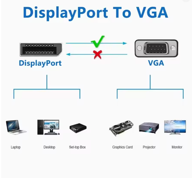 • لا يعمل: عند التوصيل من كمبيوتر (VGA) —> إلى شاشة (DisplayPort). (أي أنه لا يصلح لعكس العملية).