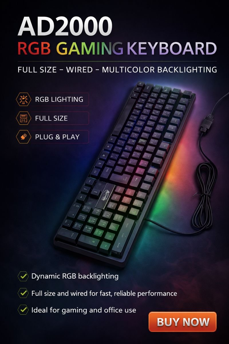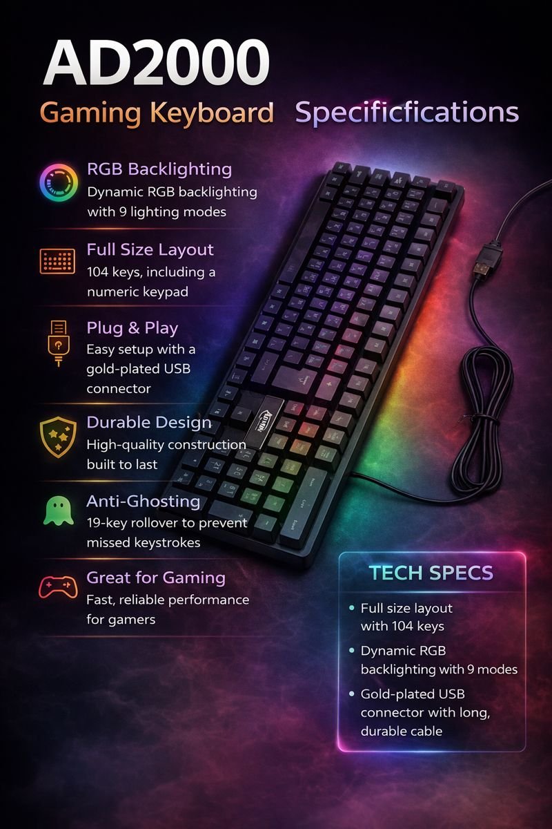 كيبورد جيمينج AD2000 بإضاءة RGB متعددة الألوان، تصميم Full Size بـ 104 زر، توصيل USB Plug & Play، أداء ثابت وسريع للألعاب والعمل اليومي.