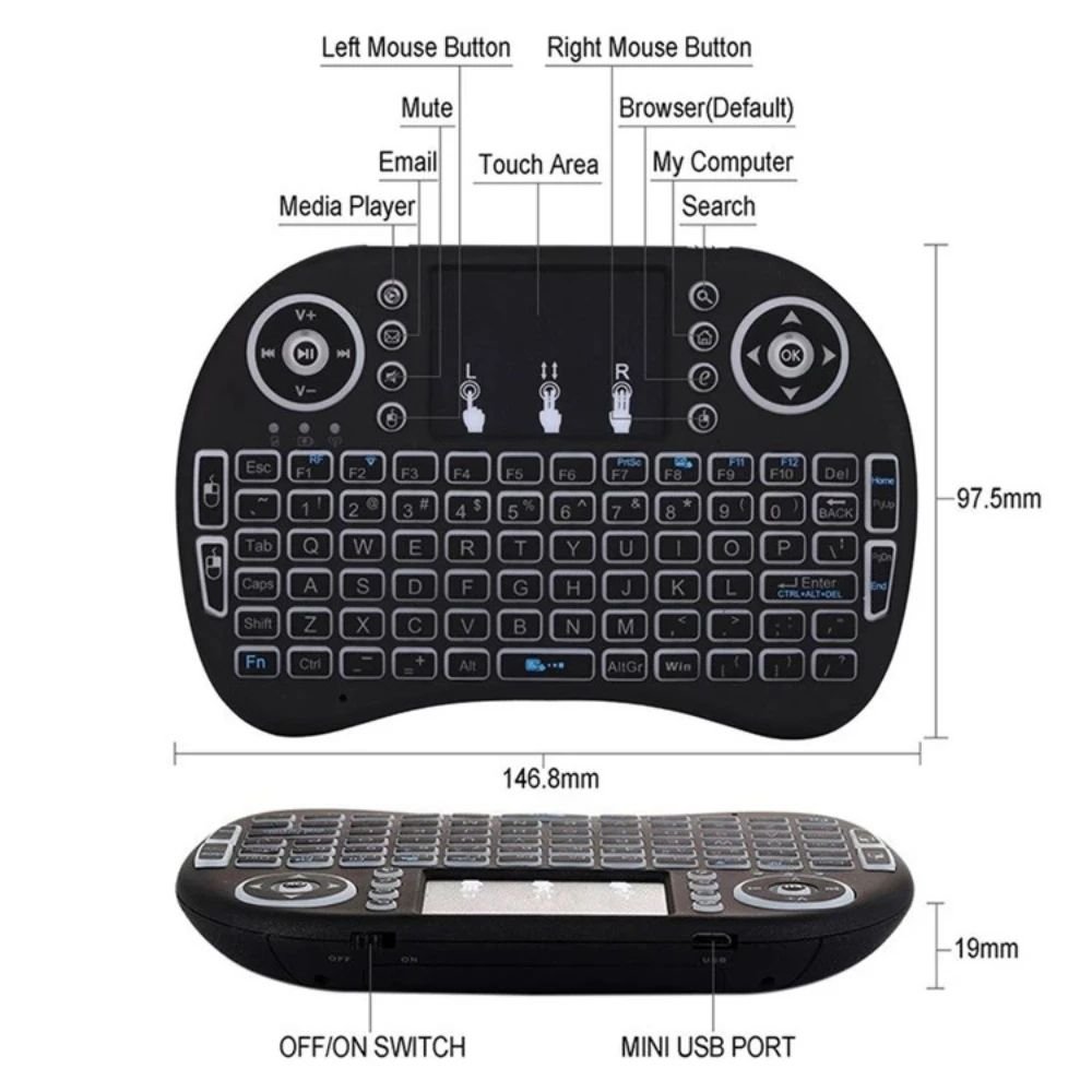 كيبورد ميني لاسلكي للتحكم في باد وإضاءة خلفية، ويمكن التحكم فيه بالكامل في التلفزيون الذكي، والكمبيوتر، وأجهزة الأندرويد بسهولة ومن أي مكان.