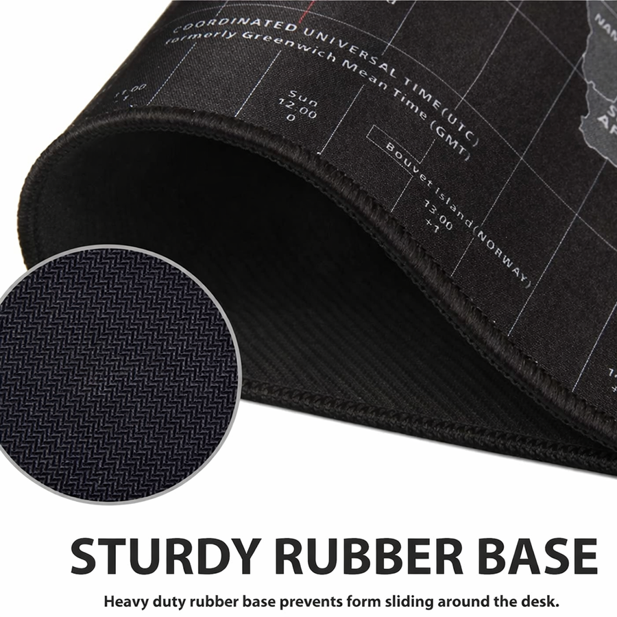 تصميم خريطة العالم بتفاصيل واضحة وخطوط مناطق زمنية سطح علوي ناعم من القماش لتحكم دقيق وسلس بالماوس قاعدة مطاطية قوية مانعة للانزلاق حواف مخيطة عالية الجودة حجم ممتد مناسب للماوس والكيبورد